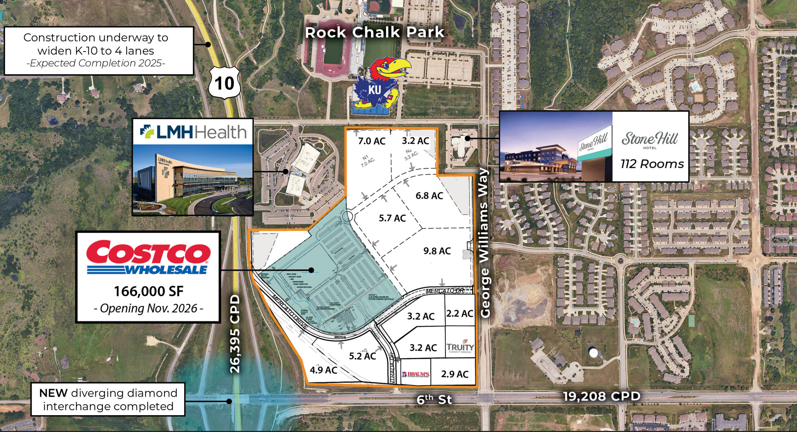 Costco anchored land sites for sale/lease/BTS located adjacent to Rock Chalk Park, the new regional sports complex and home of KU Athletics. A development project designed to grow with the city of Lawrence. Costco Wholesale opening fall 2026.